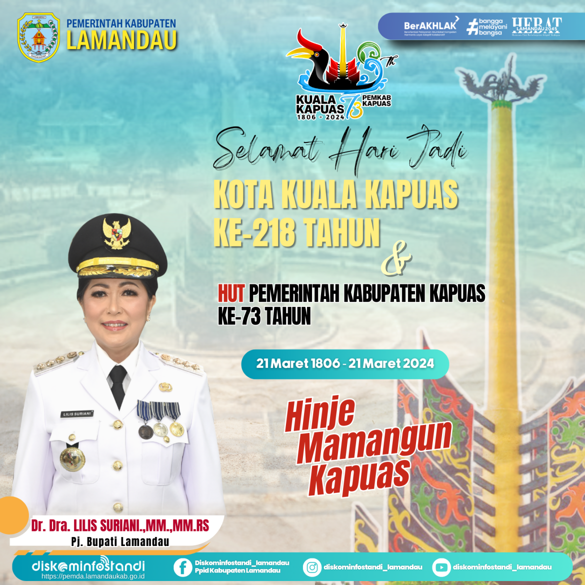 Ucapan PemdaSelamat Hari Jadi Kota Kuala Kapuas Ke-218 dan HUT Pemerintah Kabupaten Kapuas Ke-73 Tahun by Admin Kominfo Maret 21, 2024 Maret 21, 2024 180Pemerintah Kabupaten Lamandau mengucapkan Selamat Hari Jadi Kota Kuala Kapuas Ke-218 dan HUT Pemerintah Kabupaten Kapuas Ke-73 Tahun.21 Maret 1806 – 21 Maret 2024Hinje Mamangun Kapuas 0 comments 0 FacebookTwitterPinterestEmail previous post Pj Bupati Lamandau Membuka Musrenbang RKPD Kabupaten Lamandau Tahun 2025 next post Pj Bupati Lamandau Serahkan Beras Program Berbagi Berkah Ramadan Related Articles Selamat Hari Jadi ke-66 Kabupaten Barito Selatan September 21, 2025 Selamat dan Sukses (MTQH) XII Tingkat Kabupaten Lamandau... September 20, 2025 Selamat Ulang Tahun Bapak Abdul Hamid ke 57... September 12, 2025 Turut Berduka Cita Atas Wafatnya Pangeran Muasjidinsyah Agustus 18, 2025 Selamat Ulang Tahun ke-53 Gubernur Kalimantan Tengah Bapak... Agustus 17, 2025 Dirgahayu ke-80 Kemerdekaan Republik Indonesia Agustus 17, 2025 Selamat Hari Pramuka ke-64 Tahun Agustus 14, 2025 Selamat Hari Jadi ke-23 Kabupaten Lamandau Agustus 3, 2025 Selamat dan Sukses atas terselenggaranya Mubes I Dayak... Juli 28, 2025 Selamat Hari Anak Nasional Tahun 2025 Juli 23, 2025Leave a Comment Cancel ReplySave my name, email, and website in this browser for the next time I comment.