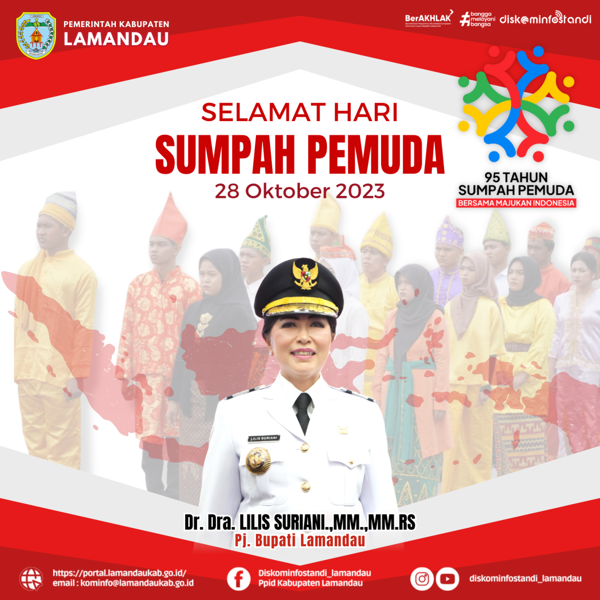 Ucapan PemdaSelamat Hari Sumpah Pemuda ke 95 by Admin Kominfo Oktober 28, 2023 Oktober 28, 2023 15Pemerintah Kabupaten Lamandau mengucapkan Selamat Hari Sumpah Pemuda | 28 Oktober 2023..“95 Tahun Sumpah Pemuda, Bersama Majukan Indonesia” 0 comments 0 FacebookTwitterPinterestEmail previous post Pj Bupati Lamandau Pimpin Upacara Peringatan Hari Sumpah Pemuda Ke 95 next post Selamat Hari Jadi ke 62 Tahun Bank Kalteng Related Articles Selamat Hari Jadi ke-66 Kabupaten Barito Selatan September 21, 2025 Selamat dan Sukses (MTQH) XII Tingkat Kabupaten Lamandau... September 20, 2025 Selamat Ulang Tahun Bapak Abdul Hamid ke 57... September 12, 2025 Turut Berduka Cita Atas Wafatnya Pangeran Muasjidinsyah Agustus 18, 2025 Selamat Ulang Tahun ke-53 Gubernur Kalimantan Tengah Bapak... Agustus 17, 2025 Dirgahayu ke-80 Kemerdekaan Republik Indonesia Agustus 17, 2025 Selamat Hari Pramuka ke-64 Tahun Agustus 14, 2025 Selamat Hari Jadi ke-23 Kabupaten Lamandau Agustus 3, 2025 Selamat dan Sukses atas terselenggaranya Mubes I Dayak... Juli 28, 2025 Selamat Hari Anak Nasional Tahun 2025 Juli 23, 2025Leave a Comment Cancel ReplySave my name, email, and website in this browser for the next time I comment.
