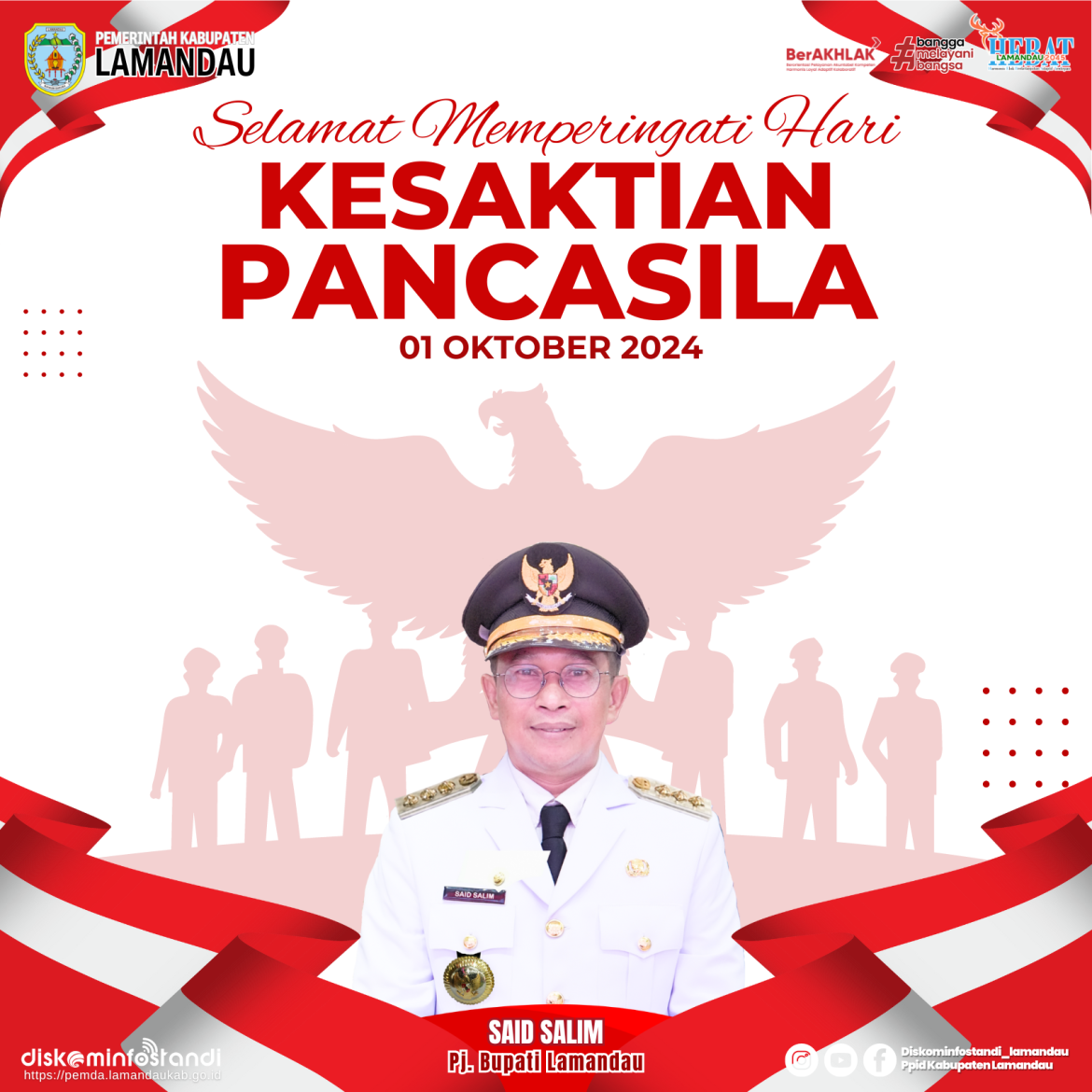Selamat Memperingati Hari Kesaktian Pancasila 01 Oktober 2024. Mari bersama kita tanamkan nilai-nilai Pancasila sebagai pedoman dalam setiap sikap, tindakan, dan perilaku, baik dalam kehidupan bermasyarakat, berbangsa, maupun bernegara. (Diskominfostandi)