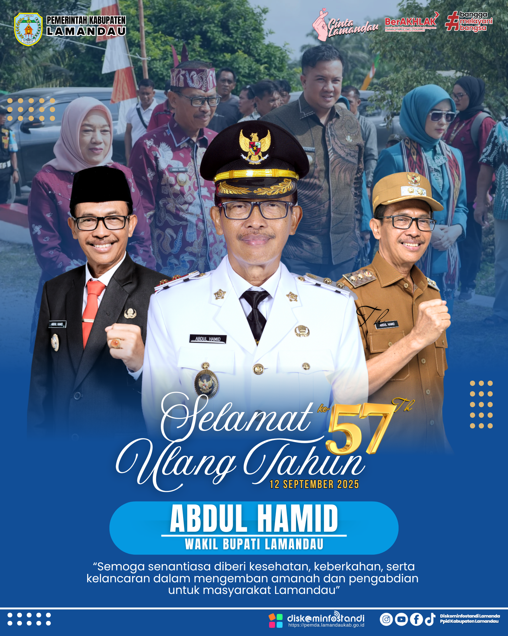 Selamat Ulang Tahun Bapak Wakil Bupati Lamandau, Abdul Hamid, yang ke 57 Tahun | 12 September 2025 “Semoga senantiasa diberi kesehatan, keberkahan, serta kelancaran dalam mengemban amanah dan pengabdian untuk masyarakat Lamandau”