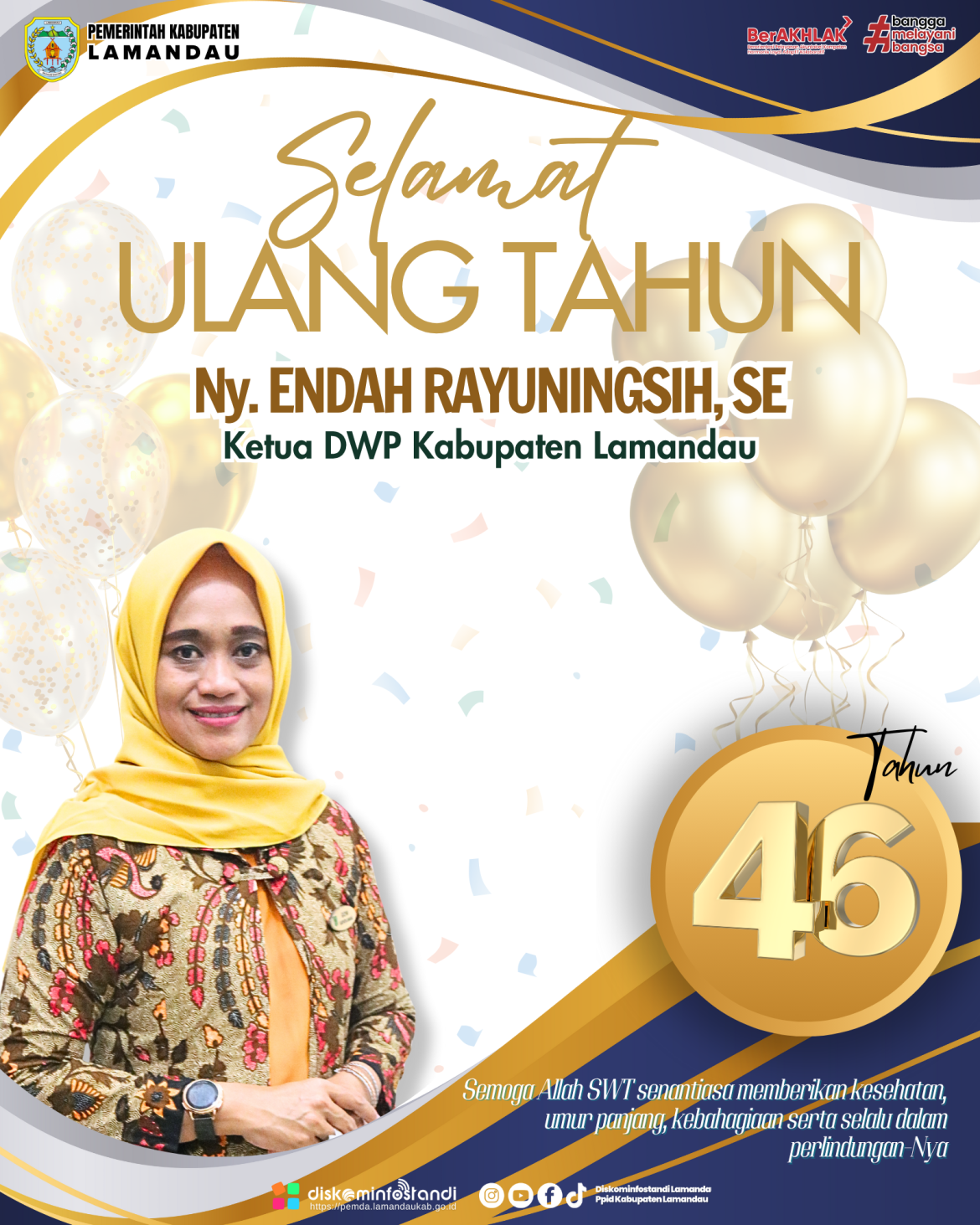 Selamat Ulang Tahun ke-46 Ketua DWP Kabupaten Lamandau Ny. Endah Rahayuningsih, SE. “Semoga Allah SWT senantiasa memberikan kesehatan, umur panjang, kebahagiaan serta selalu dalam perlindungan-Nya”
