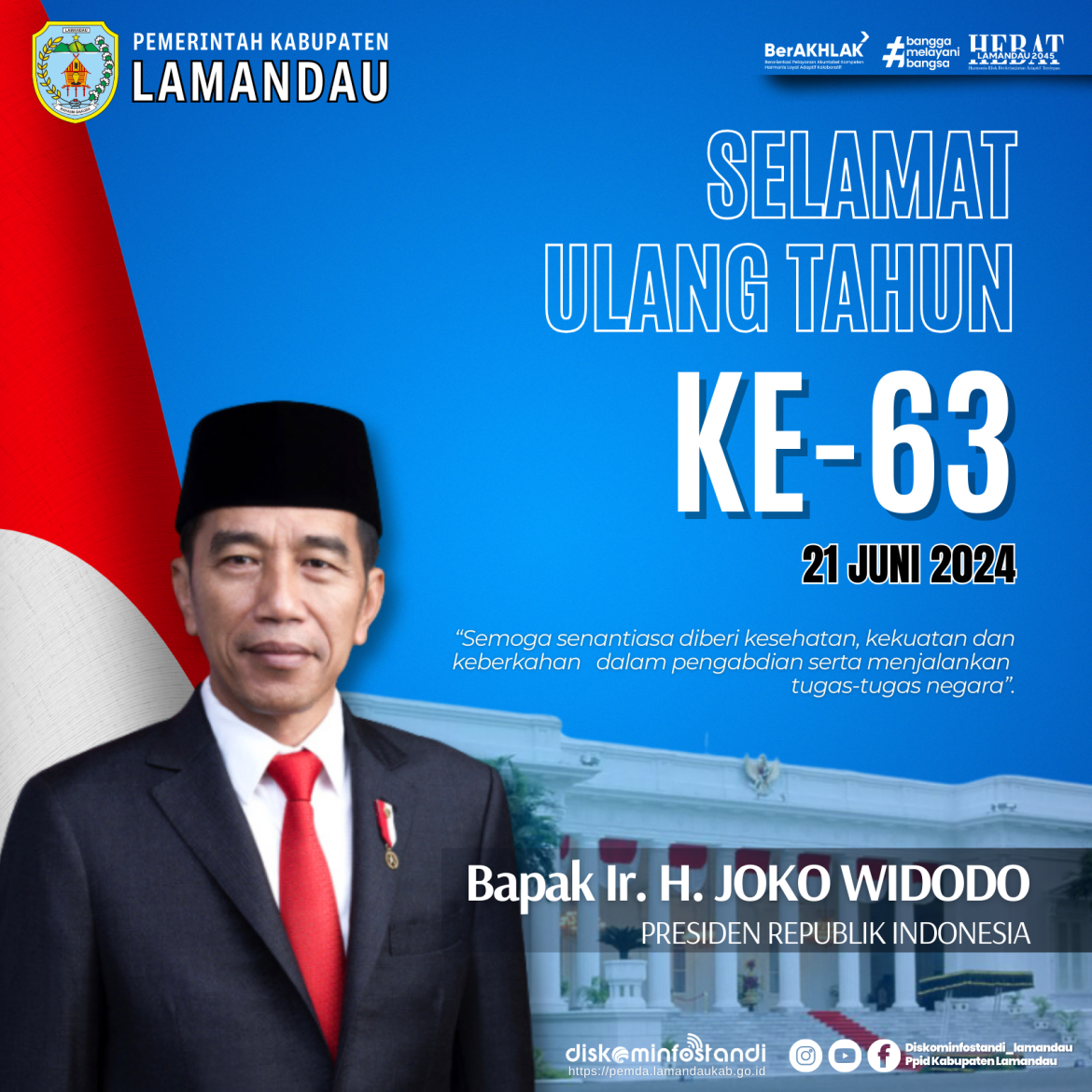 Pemerintah Kabupaten Lamandau mengucapkan Selamat Ulang Tahun ke-63 (21 Juni 2024) kepada Presiden Republik Indonesia Bapak Ir. H. Joko Widodo, “Semoga senantiasa diberi kesehatan, kekuatan dan keberkahan dalam pengabdian serta menjalankan tugas-tugas negara”.