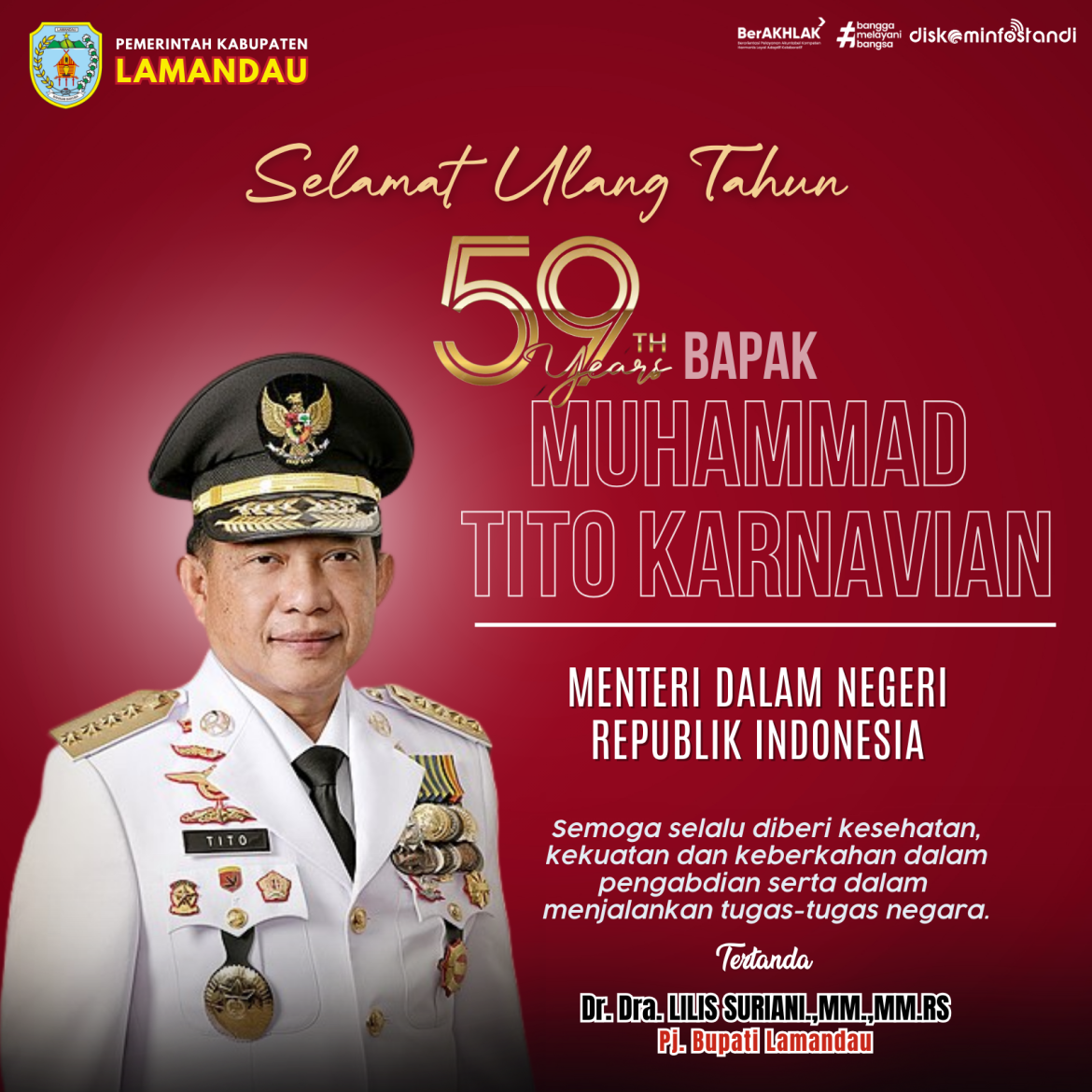 Ucapan PemdaSelamat Ulang Tahun Kemendagri RI by Admin Kominfo Oktober 26, 2023 Oktober 26, 2023 217Pemerintah Kabupaten Lamandau mengucapkan Selamat Ulang Tahun ke 59,kepada Bapak Muhammad Tito Karnavian, Menteri Dalam Negeri Republik Indonesia“Semoga selalu diberi kesehatan, kekuatan dan keberkahan dalam pengabdian serta dalammenjalankan tugas-tugas negara.” 0 comments 0 FacebookTwitterPinterestEmail previous post Dukung Suksesnya Pilkada 2024, Pj Bupati Lamandau Tandatangani NPHD Bersama KPU dan Bawaslu next post Pj Bupati Buka Sosialisasi Pembentukan Forum Pengurangan Risiko Bencana Kabupaten Lamandau Related Articles Selamat Hari Jadi ke-66 Kabupaten Barito Selatan September 21, 2025 Selamat dan Sukses (MTQH) XII Tingkat Kabupaten Lamandau... September 20, 2025 Selamat Ulang Tahun Bapak Abdul Hamid ke 57... September 12, 2025 Turut Berduka Cita Atas Wafatnya Pangeran Muasjidinsyah Agustus 18, 2025 Selamat Ulang Tahun ke-53 Gubernur Kalimantan Tengah Bapak... Agustus 17, 2025 Dirgahayu ke-80 Kemerdekaan Republik Indonesia Agustus 17, 2025 Selamat Hari Pramuka ke-64 Tahun Agustus 14, 2025 Selamat Hari Jadi ke-23 Kabupaten Lamandau Agustus 3, 2025 Selamat dan Sukses atas terselenggaranya Mubes I Dayak... Juli 28, 2025 Selamat Hari Anak Nasional Tahun 2025 Juli 23, 2025Leave a Comment Cancel ReplySave my name, email, and website in this browser for the next time I comment.