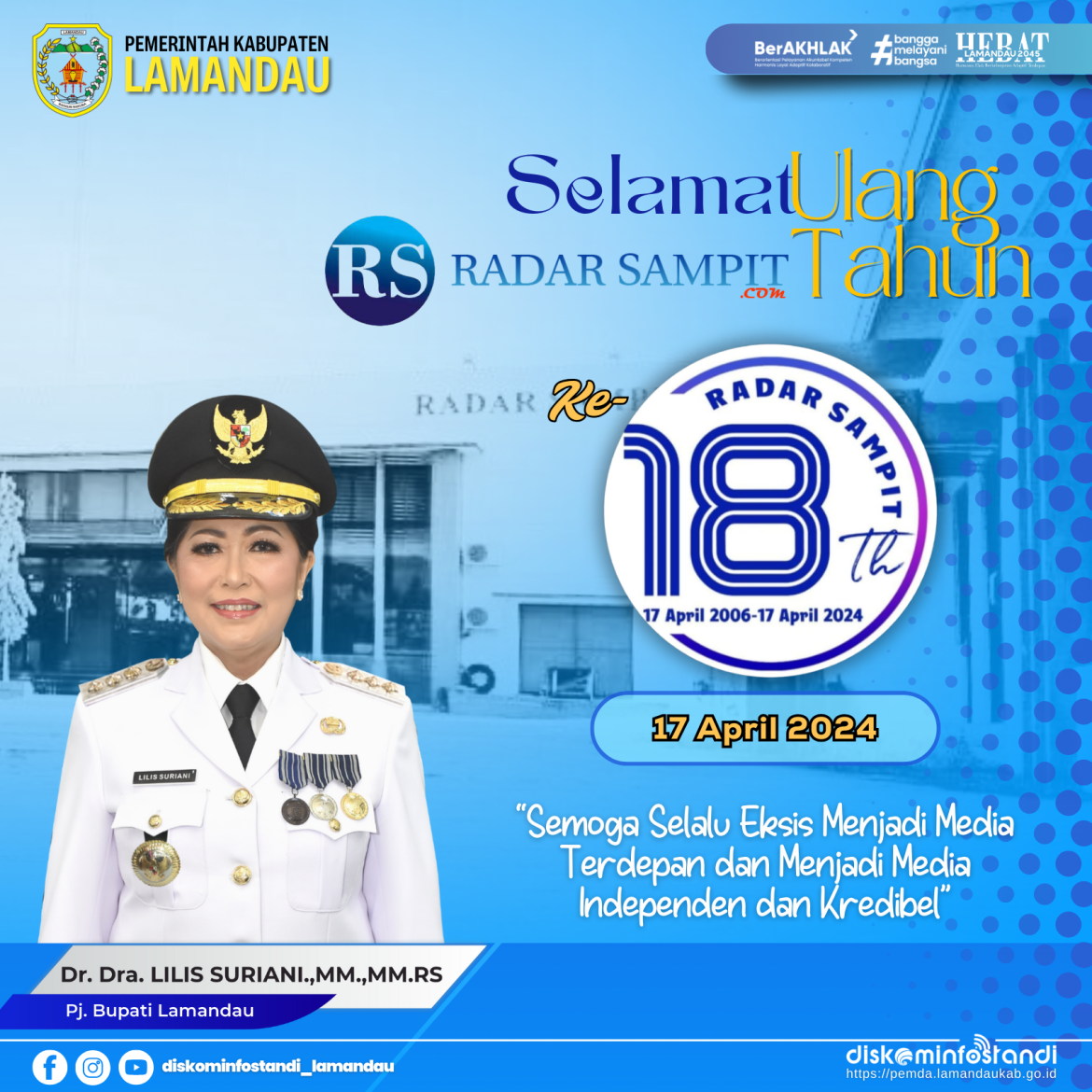 Ucapan PemdaSelamat Ulang Tahun Media Radar Sampit ke 18 Tahun by Admin Kominfo April 17, 2024 April 17, 2024 349Pemerintah Kabupaten Lamandau mengucapkan Selamat Ulang Tahun Media Radar Sampit ke 18 Tahun.“Semoga selalu Eksis menjadi Media Terdepan dan menjadi Media Independen dan Kredibel” 0 comments 0 FacebookTwitterPinterestEmail previous post Pj Bupati Lamandau Terima Entry Meeting BPK RI Provinsi Kalteng next post Irjen Kemendagri Lakukan Pra Evaluasi Pj Bupati Lamandau Triwulan I Tahun 2024 Related Articles Selamat Hari Jadi ke-66 Kabupaten Barito Selatan September 21, 2025 Selamat dan Sukses (MTQH) XII Tingkat Kabupaten Lamandau... September 20, 2025 Selamat Ulang Tahun Bapak Abdul Hamid ke 57... September 12, 2025 Turut Berduka Cita Atas Wafatnya Pangeran Muasjidinsyah Agustus 18, 2025 Selamat Ulang Tahun ke-53 Gubernur Kalimantan Tengah Bapak... Agustus 17, 2025 Dirgahayu ke-80 Kemerdekaan Republik Indonesia Agustus 17, 2025 Selamat Hari Pramuka ke-64 Tahun Agustus 14, 2025 Selamat Hari Jadi ke-23 Kabupaten Lamandau Agustus 3, 2025 Selamat dan Sukses atas terselenggaranya Mubes I Dayak... Juli 28, 2025 Selamat Hari Anak Nasional Tahun 2025 Juli 23, 2025Leave a Comment Cancel ReplySave my name, email, and website in this browser for the next time I comment.