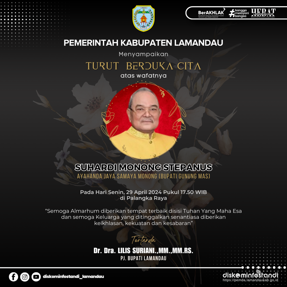 Pemerintah Kabupaten Lamandau menyampaikan Turut Berduka Cita atas wafatnya SUHARDI MONONG STEPANUS, Ayahanda Jaya Samaya Monong (Bupati Gunung Mas).