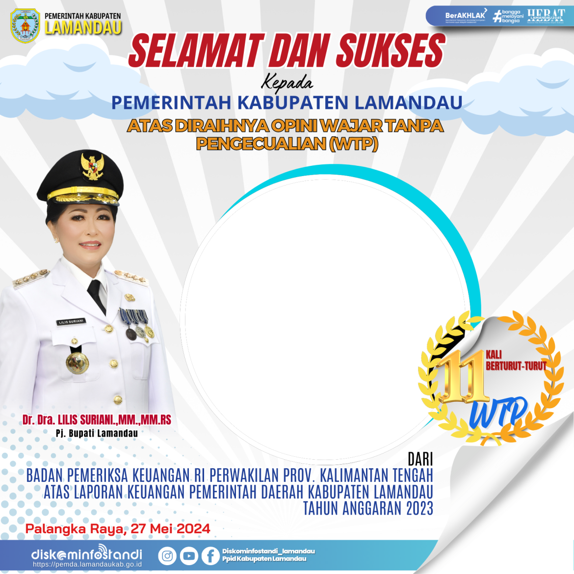 Twibbonize Selamat dan Sukses Pemkab Lamandau atas diraihnya Opini WTP 11 Kali berturut-turut dari BPK RI Perwakilan Prov. Kalteng atas Lap. Keuangan Pemda Kab. Lamandau Tahun 2023. link : https://twb.nz/kablamandauwtp11