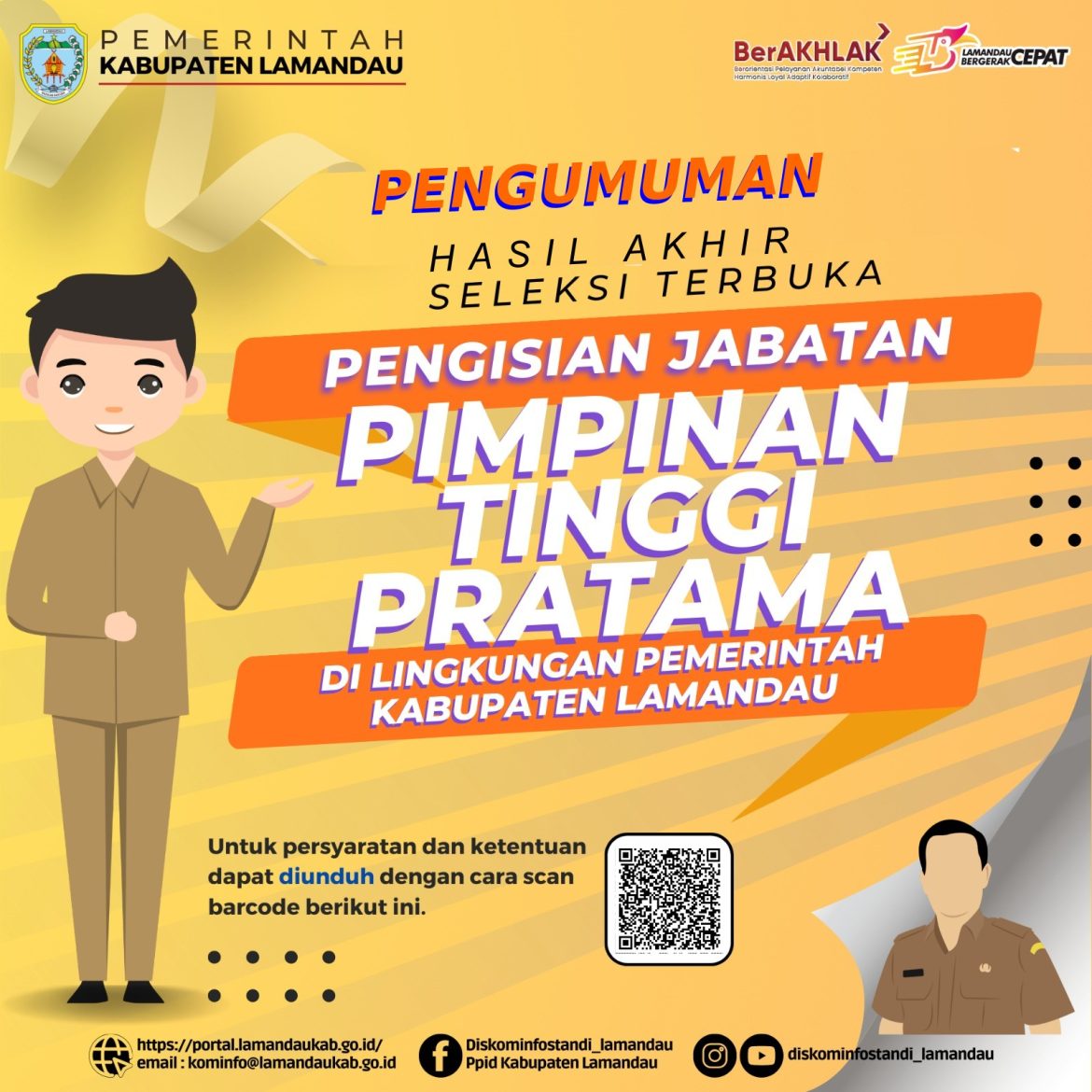 Lamandau/LBC – Pengumuman Ketua Panitia Seleksi Jabatan Pimpinan Tinggi Pratama Secara Terbuka di Lingkungan Pemerintah Kabupaten Lamandau, Nomor : 12/JPTP/III/2023 tanggal 30 Maret 2023 tentang Hasil Akhir Seleksi Terbuka Pengisian Jabatan Pimpinan Tinggi Pratama di Lingkungan Pemerintah Kabupaten Lamandau Tahun 2023. Hal-hal yang disampaikan lebih jelas dapat dilihat Link Ini.