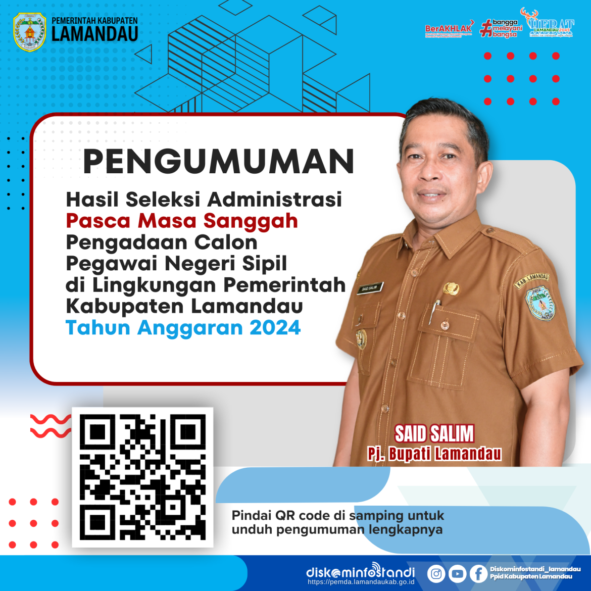 Berikut disampaikan Pengumunan Hasil Seleksi Administrasi Pasca Masa Sanggah Pengadaan Calon Pegawai Negeri Sipil di Lingkungan Pemerintah Kabupaten Lamandau Tahun Anggaran 2024. Pindai QR code pada flyer untuk unduh pengumuman lengkapnya, atau klik link https://pemda.lamandaukab.go.id/wp-content/uploads/2024/09/Pengumuman-Seleksi-Administrasi-Pasca-Sanggah-CPNS-Kabupaten-Lamandau-T.A.-2024.pdf