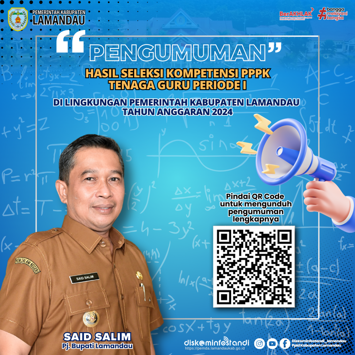 Berikut disampaikan Hasil Seleksi Kompetensi PPPK Tenaga Guru Periode I di Lingkungan Pemerintah Kabupaten Lamandau Tahun Anggaran 2024. Pindai QR Code untuk mengunduh pengumuman lengkapnya atau klik link : https://drive.google.com/file/d/1OSlAF8D4BbAqMgtIJ6J8TAF_ArgZUuRU/view. (Diskominfostandi)