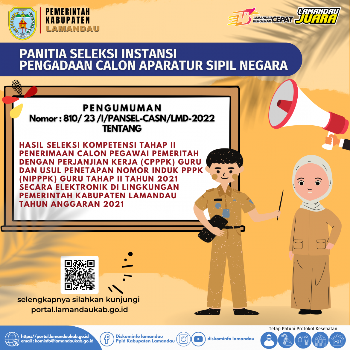 Lamandau – Pengumuman Panitia Seleksi Instansi Pengadaan Calon Aparatur Sipil Negara Kabupaten Lamandau Nomor : 810/23/I/PANSEL-CASN/LMD-2022 tentang Hasil Seleksi Kompetensi Tahap II Penerimaan Calon Pegawai Pemerintah Dengan Perjanjian Kerja (CPPPK) Guru dan Usul Penetapan Nomor Induk PPPK (NIPPPK) Guru Tahap II Tahun 2021 Secara Elektronik di Lingkungan Pemerintah Kabupaten Lamandau Tahun Anggaran 2021.