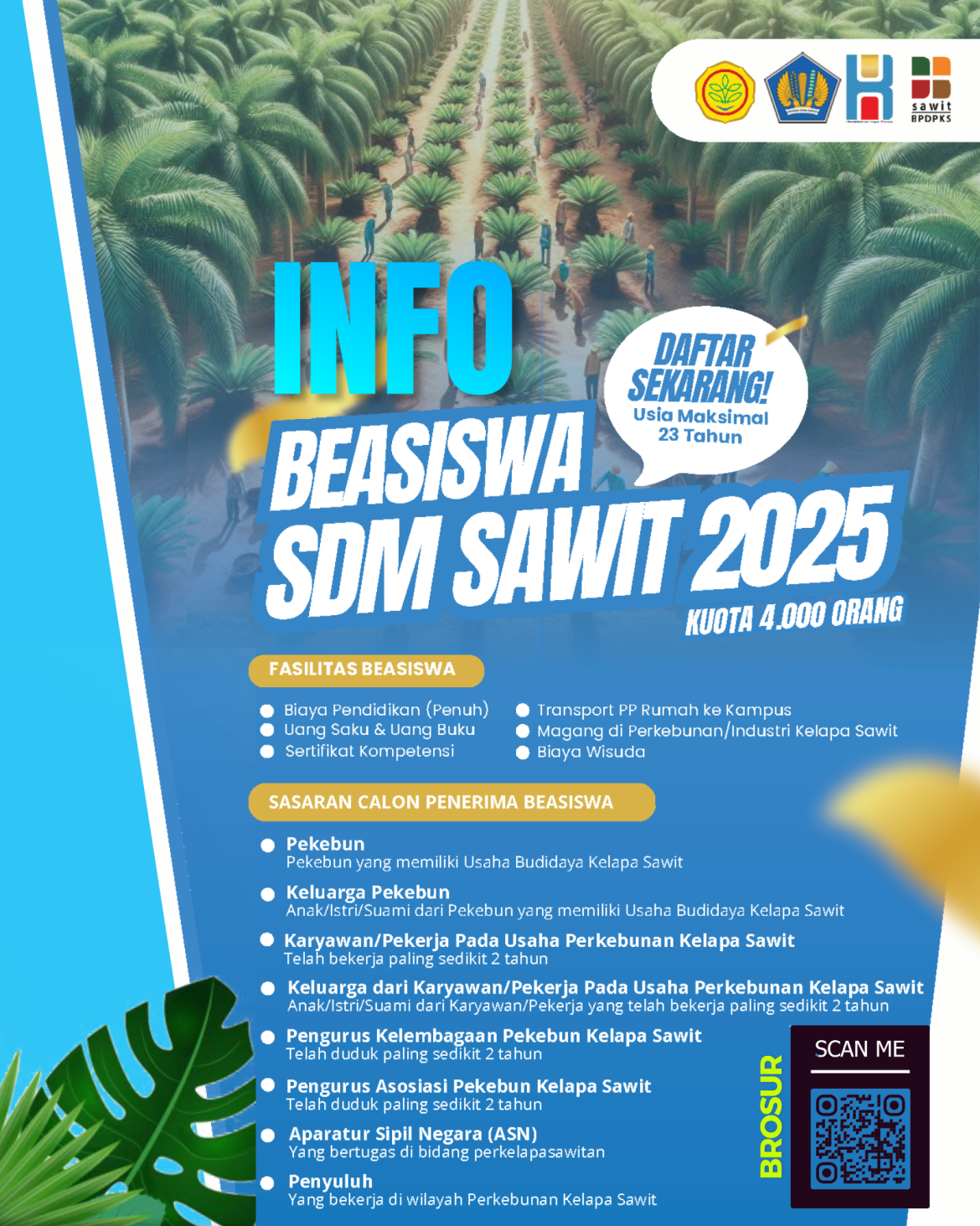 Direktorat Jenderal Perkebunan dengan dukungan pendanaan dari Badan Pengelola Dana Perkebunan Kelapa Sawit (BPDPKS) membuka Seleksi Nasional Beasiswa Pendidikan Tinggi Vokasi (DI, DII, DIII dan DIV) dan Akademik (Strata 1) Perkebunan Kelapa Sawit Tahun 2025. Program ini diharapkan dapat mencetak generasi muda perkebunan sawit yang dapat terus secara konsisten meningkatkan industri perkelapasawitan di Indonesia dan dunia. Ayo Putra Putri Lamandau jangan lewatkan kesempatan baik ini, untuk info pendaftaran/brosur silahkan scan barcode yang tersedia pada flyer. Gratis dan Tidak Dipungut Biaya !!!