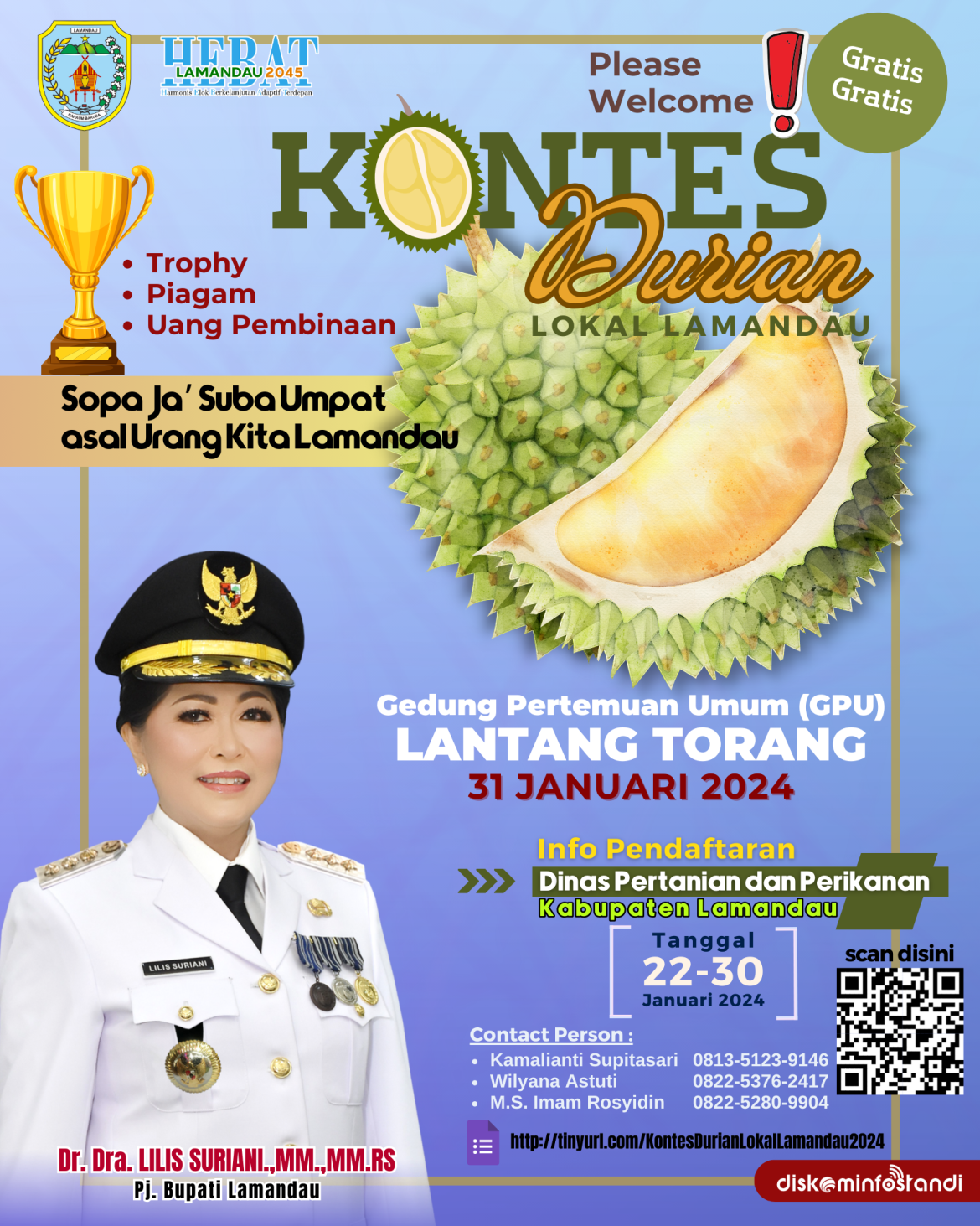 Dalam rangka menggali potensi Durian Lokal di Kabupaten Lamandau Tahun 2024, Pemerintah Kabupaten Lamandau akan menyelenggarakan Kontes Durian Lokal yang diharapkan dapat menjadi ajang perkenalan berbagai varietas buah durian lokal khas daerah serta menggali potensi durian lokal dalam rangka kelestarian Sumber Daya Genetik (SDG) Kabupaten Lamandau.