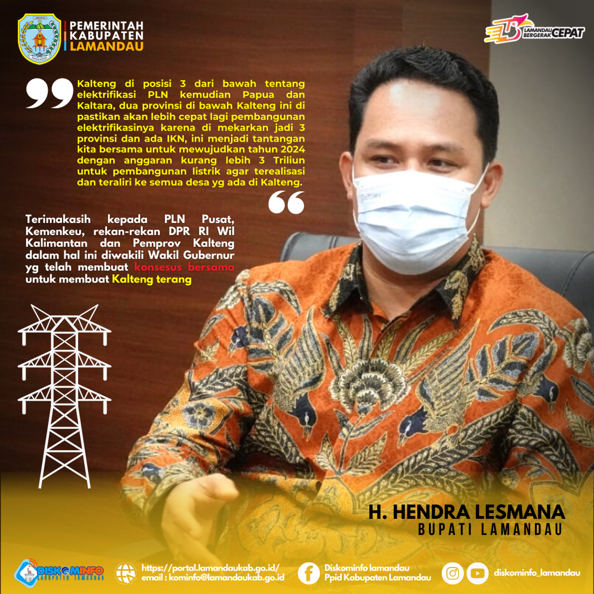 Pembangunan listrik di Kabupaten Lamandau segera dipercepat, harapannya pada tahun 2024 dari 88 desa/kelurahan sudah teraliri listrik secara penuh, diantaranya penambahan pada tahun 2022 sudah terdapat 6 desa, tahun 2023 ada 12 desa serta tahun 2024 mendatang akan ada 22 desa yang teraliri listrik.