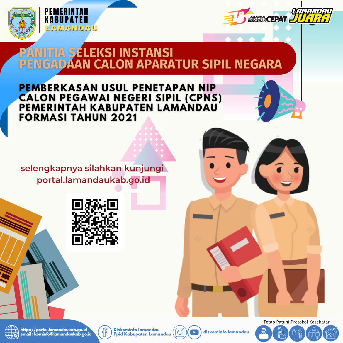 LBC – Kepada seluruh peserta yang dinyatakan lulus seleksi CPNS disampaikan pengumuman Panitia Seleksi Instansi Pengadaan Calon Aparatur Sipil Negara Kabupaten Lamandau, Nomor : 810/22/I/PANSEL-CASN/LMD-2022 tanggal 6 Januari 2022 tentang Pemberkasan Usul Penetapan NIP Calon Pegawai Negeri Sipil (CPNS) Pemerintah Kabupaten Lamandau Formasi Tahun 2021.