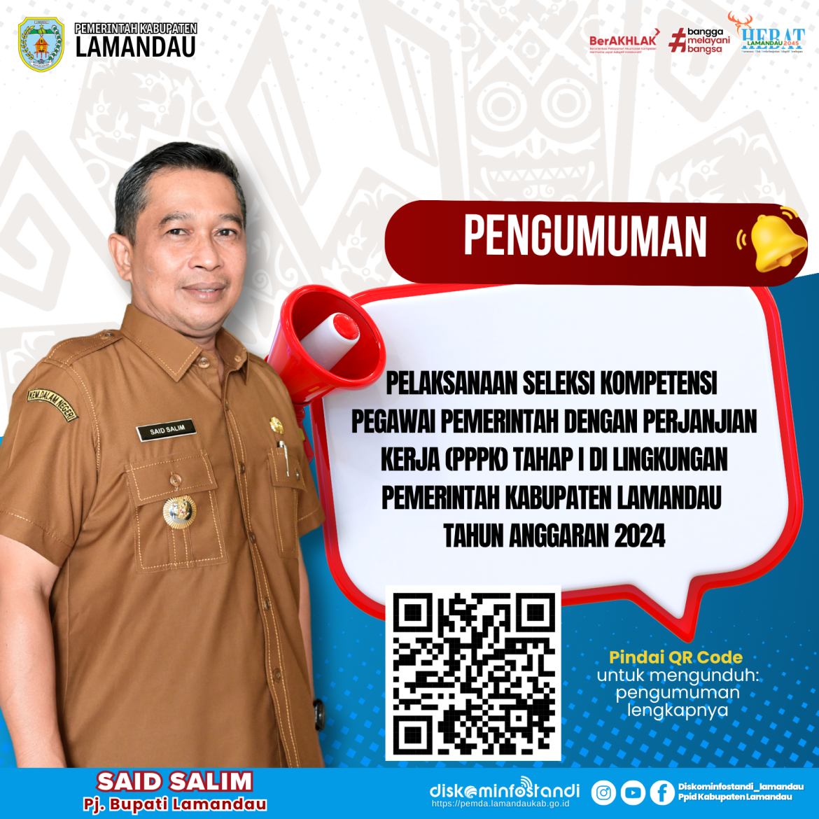 Berikut disampaikan Pengumuman Pelaksanaan Seleksi Kompetensi Pegawai Pemerintah dengan Perjanjian Kerja (PPPK) Tahap I di Lingkungan Pemerintah Kabupaten Lamandau Tahun Anggaran 2024. Informasi lebih lengkap dapat diakses melalui QR code pada flyer atau link berikut : https://drive.google.com/file/d/1OSlAF8D4BbAqMgtIJ6J8TAF_ArgZUuRU/view. (Diskominfostandi)