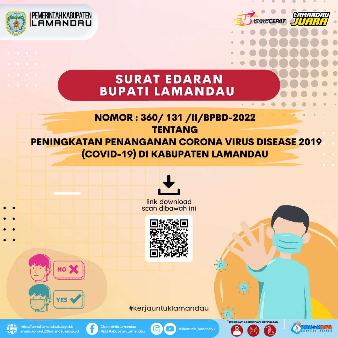 LBC – Menindaklanjuti Surat Edaran Gubernur Kalimantan Tengah Nomor 443.1/07 /Satgas Covid-19 tentang Peningkatan Penanganan Covid-19 di Wilayah Provinsi Kalimantan Tengah, dan memperhatikan perkembangan penyebaran Corona Virus Disease 2019 (COVID-19) yang cenderung mengalami peningkatan dan adanya penyebaran Virus Covid-19 varian Omicron, agar memperhatikan dan melaksanakan seperti apa yang tertuang dalam Surat Edaran Bupati lamandau Nomor : 360/ 131 /II/BPBD-2022 tentang Peningkatan Penanganan Corona Virus Disease 2019 (Covid-19) di Kabupaten Lamandau.